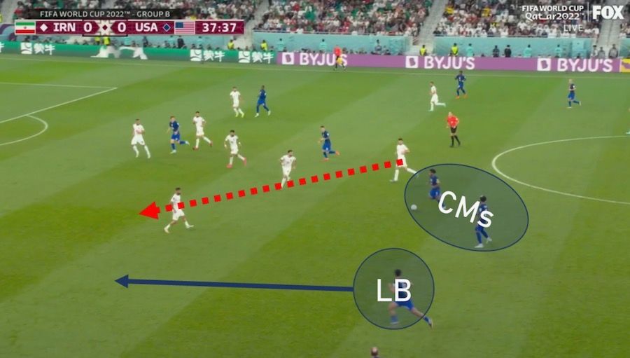 Crucially, Weston McKennie stayed in the center rather than make an underlapping run behind Robinson. He noticed that Iran was willing to sink low, bided his time, and found space as a result.