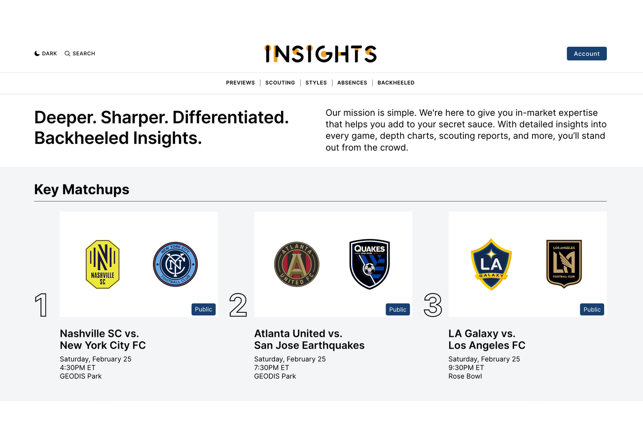 Introducing Insights, a brand-new premium tier inside Backheeled designed to push the boundaries of MLS analysis. Insights integrates multiple layers of data, league expertise, and 24/7 attention and diligence, all to help you be sharper.