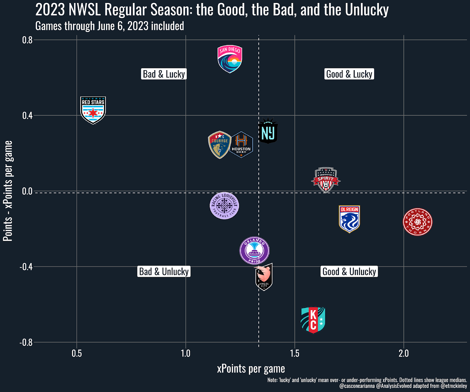 We’re just under halfway through the 2023 NWSL regular season, and each team has 10 games under their belts. With so much movement up and down the NWSL standings through the first half of the season, now’s a good time to revisit the Good-Bad/Lucky-Unlucky visualization from last season.