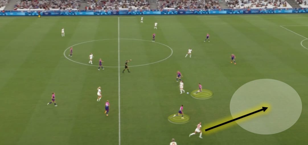 Hayes' decision to stick with the back three meant that the right back, Emily Fox, stayed back alongside center backs Naomi Girma and Tierna Davidson during build-up. This is no doubt a measure taken to control games, to ensure numbers behind the ball in case of turnovers, and to deny teams like Germany so much space to counter attack into.